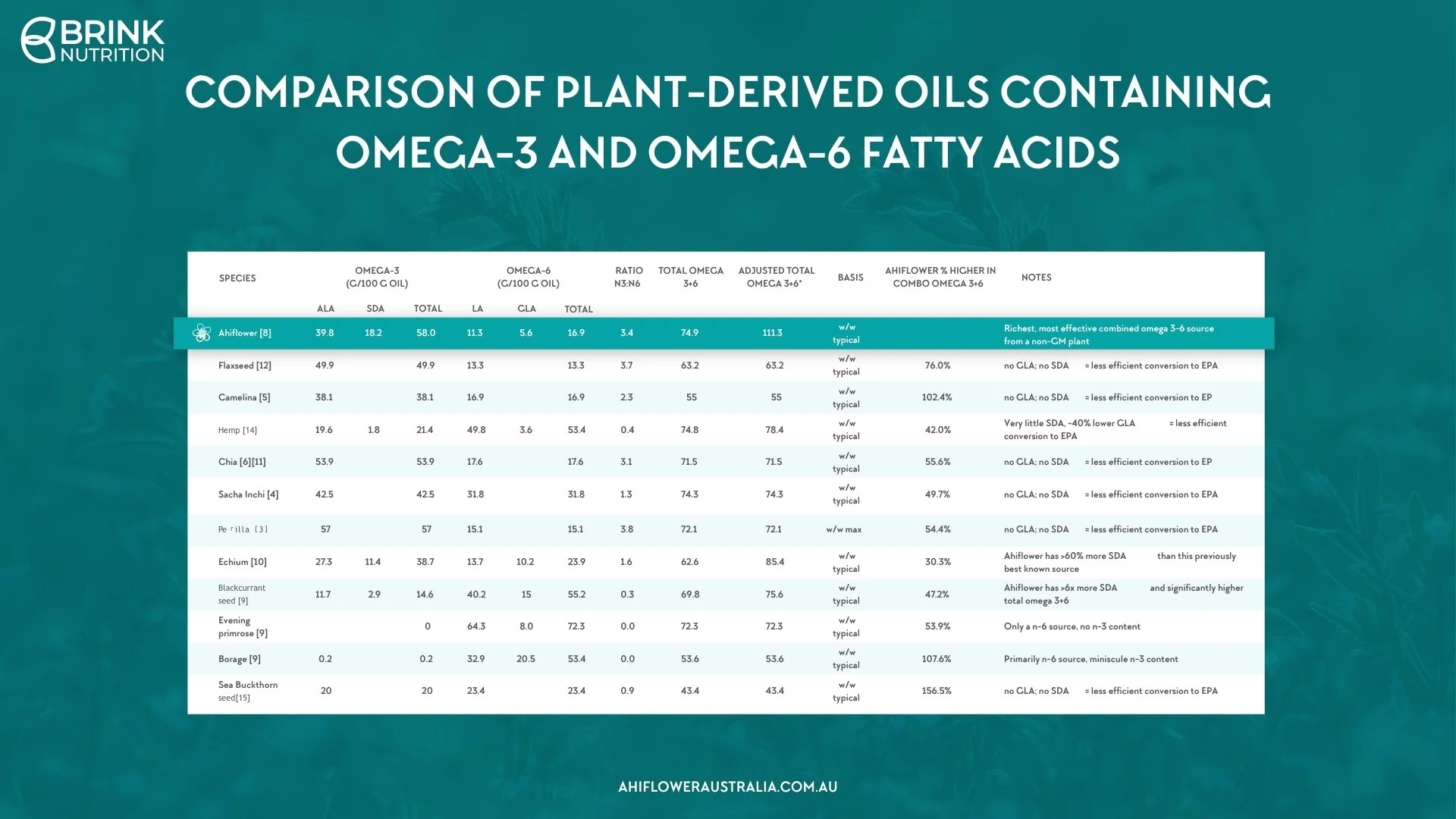 Ahiflower® is the highest in combined ALA and SDA of any commercially available consumed plant